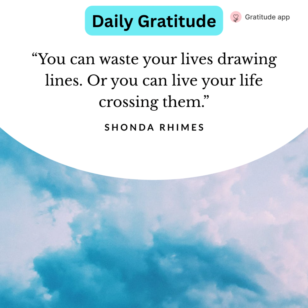 Daily Gratitude: This is so profound and bears examination in your own world and life. Some people spend their whole lives not only drawing lines but finding them where they don’t even exist. Why? So they don’t have to summon their courage and take a chance. That’s what this is all about, simply taking a chance. And that’s usually because of fear. Fear of so many things. Mostly it’s fear of failure but not just because of the failure but because of what others might think or say about you because you failed. Babies don’t hesitate to try to walk or climb up on things….until they are yelled at. Then they may become more cautious rather than curious. Can you put blinders on and stop looking around and behind you, wondering what people are or will think about you if you cross that line? Why do you really care anyway? Just take that step and I bet you will feel something like “wow that didn’t hurt at all. Maybe I can take another one.” Soon you’ll be all across the line!
