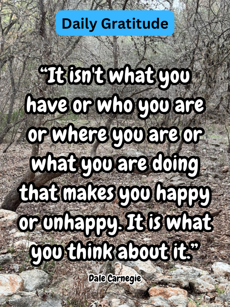 Daily Gratitude: This makes so much sense if you think about it. Especially remembering one of my favorite quotes – from William Shakespeare- “Nothing is good or bad but thinking makes it so.”