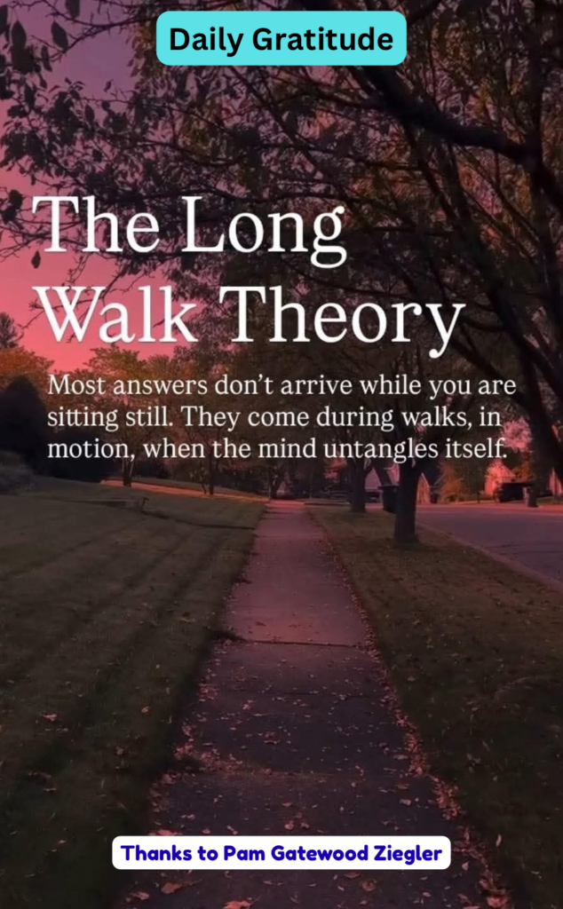 Daily Gratitude: You can imagine how this struck me when I saw it on Pam’s Facebook page. Why? Because I love to walk. And many of my thoughts and ideas have become more defined while walking. I’m slow and unless I’m in a race it doesn’t bother me. Why? Because I see so much and can marvel at nature. The other day I saw the most astounding thing I’d seen in a long time. Don’t get excited- I’m sure you’ll think “geez, you need to get a life Terrie!” I had just been to the botanical gardens with a friend who is brilliant (not just with flowers and plants but in life). She was telling me this and that and part of my brain was trying to remember what she was saying but another part was trying to find the perfect photo. When I got home I decided to go for a long walk (for me right now 7 miles is long) so I headed out on our greenway path. I passed a section that had lots of white flowers blooming. It was beautiful and I don’t remember that many of them being “out” at one time. The next morning I had to walk early and as I passed the same section they appeared to have died. I was bummed out that they had only lasted one day (notice the self-centered aspect here – I had only been back out on that trail for one day so I automatically thought the flowers were only blooming that day. They might have been out for a week for all I knew). I continued on and on my way back 2 hours later they were all blooming AGAIN. wow. “Had new ones shown up or were these the same ones that had maybe hunkered down for the night only to show back up in the sunlight the next day?” I had never noticed this before – my awareness hadn’t been honed in on that phenomenon. why did I notice it then? Because my brain (specifically my RAS, reticular activating system) had been stimulated. I bet you’re yawning right now wondering what that has to do with anything. It has to do with priming the pump. If you have an issue (not necessarily a problem but it can be; or it can be an idea rolling around in your head), think about it for a few minutes before you leave for your walk. This will get the RAS going and you’ll be surprised at what will surface during your walk. Take the time to prime the pump just like I did (unknowingly) by going to the botanical gardens before my walk. See what issues you can solve and what ideas you can come up with. Let us know.