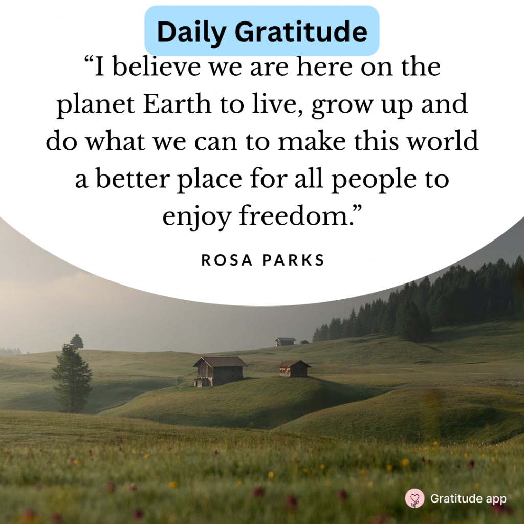 Daily Gratitude: This is a pretty simple philosophy but an oh so powerful one. It’s also a goal toward which we all should aspire – every day. We are in a time when freedom is being threatened and maybe you feel as if there isn’t much you can do about it. But there is. Each day you can do what is within your scope and your power to let people know you care about their freedom and happiness. Maybe it’s leaving a bigger tip than usual. Maybe it’s giving money to someone on the street. Maybe it’s just smiling at a someone. How is that fostering freedom? Because if you’re smiling at someone it’s highly unlikely that you’re going to beat them up or rob them. You’re giving them a sense of belonging (to the human race) and that’s freedom in and of itself.